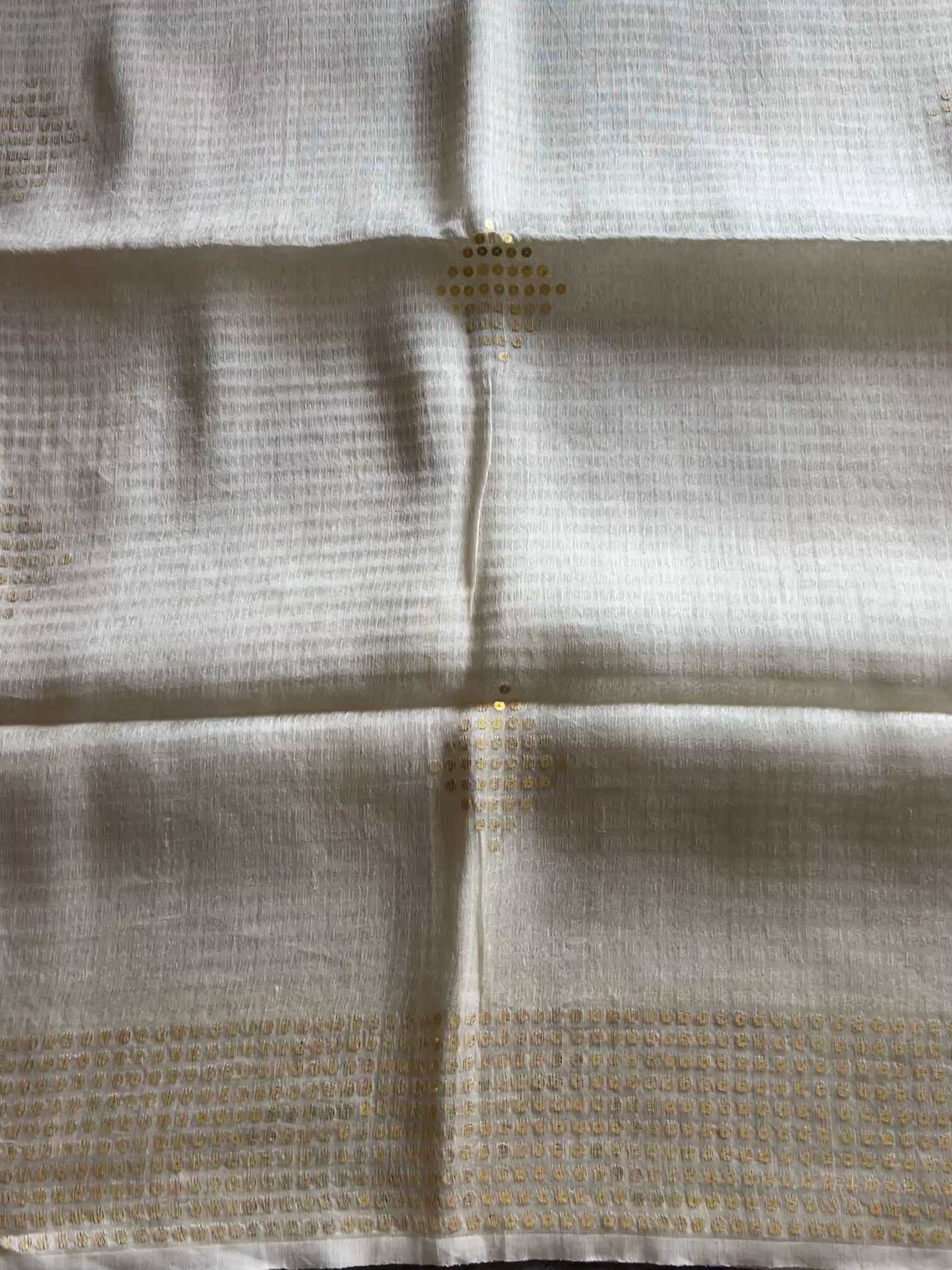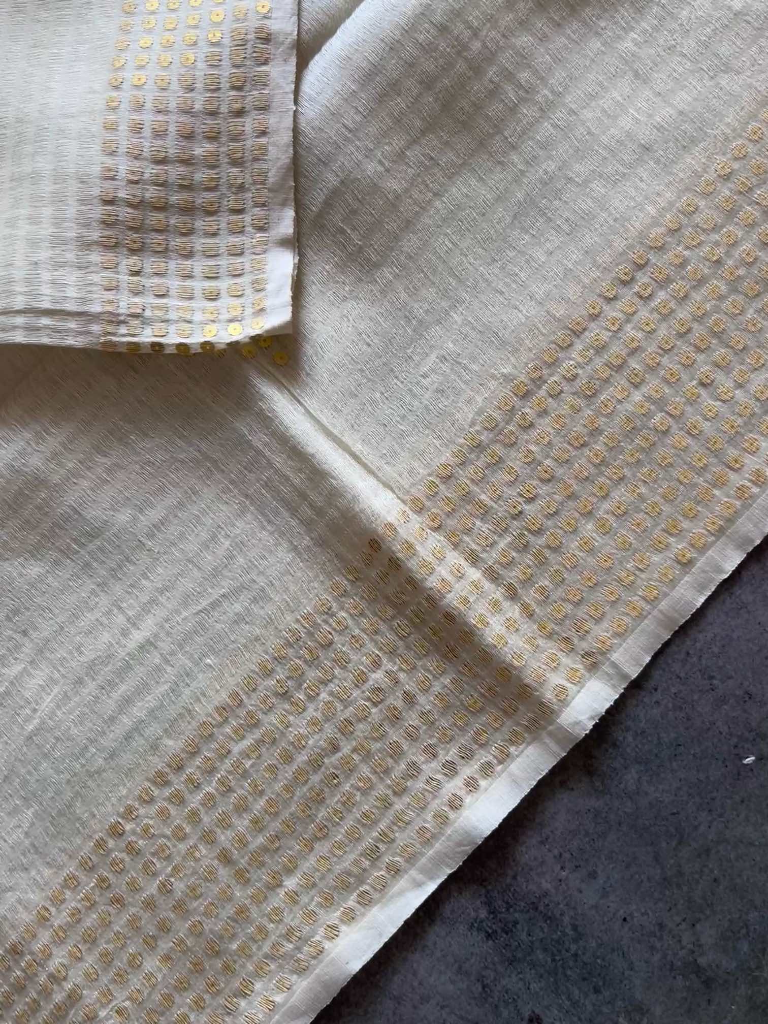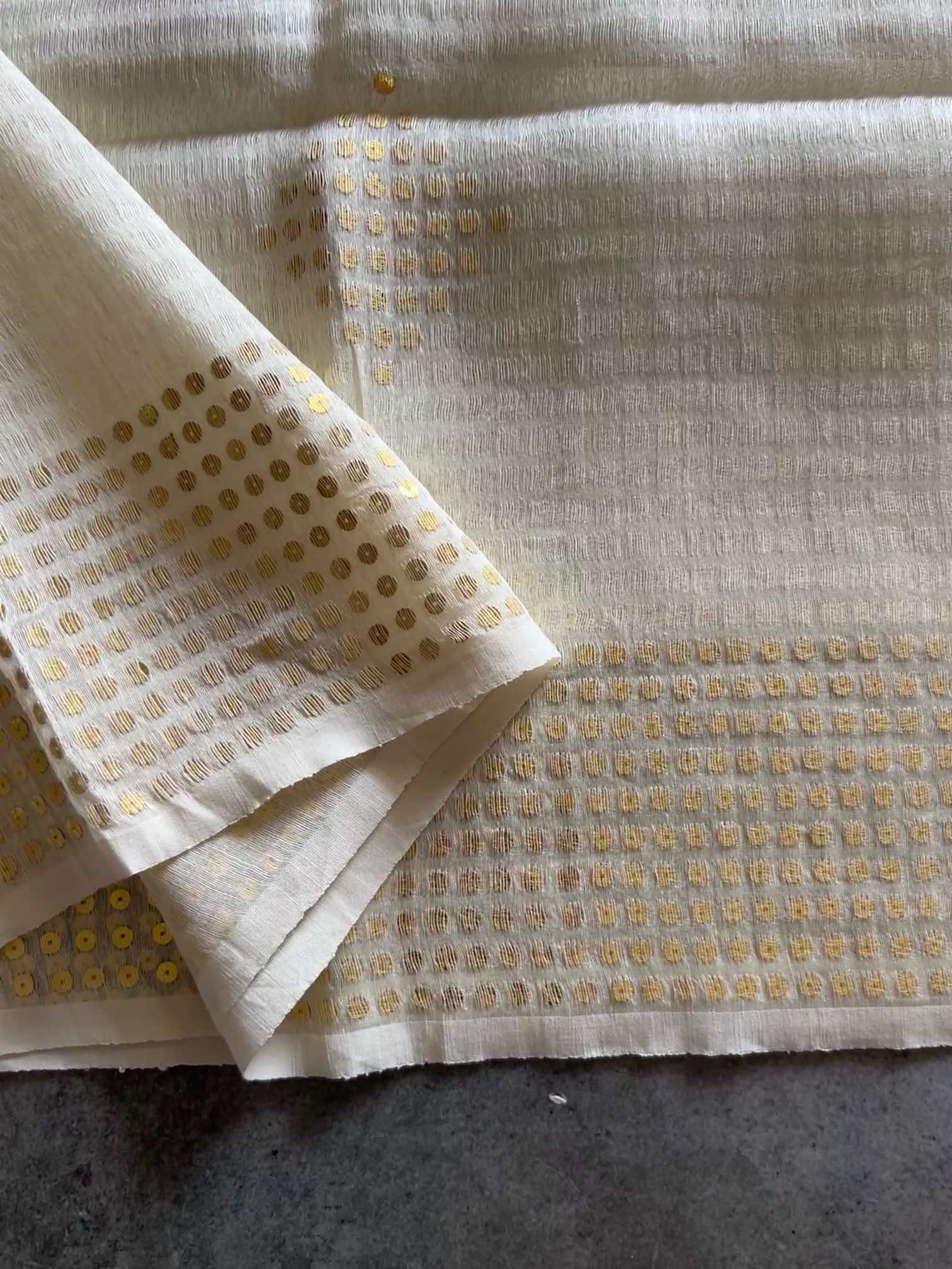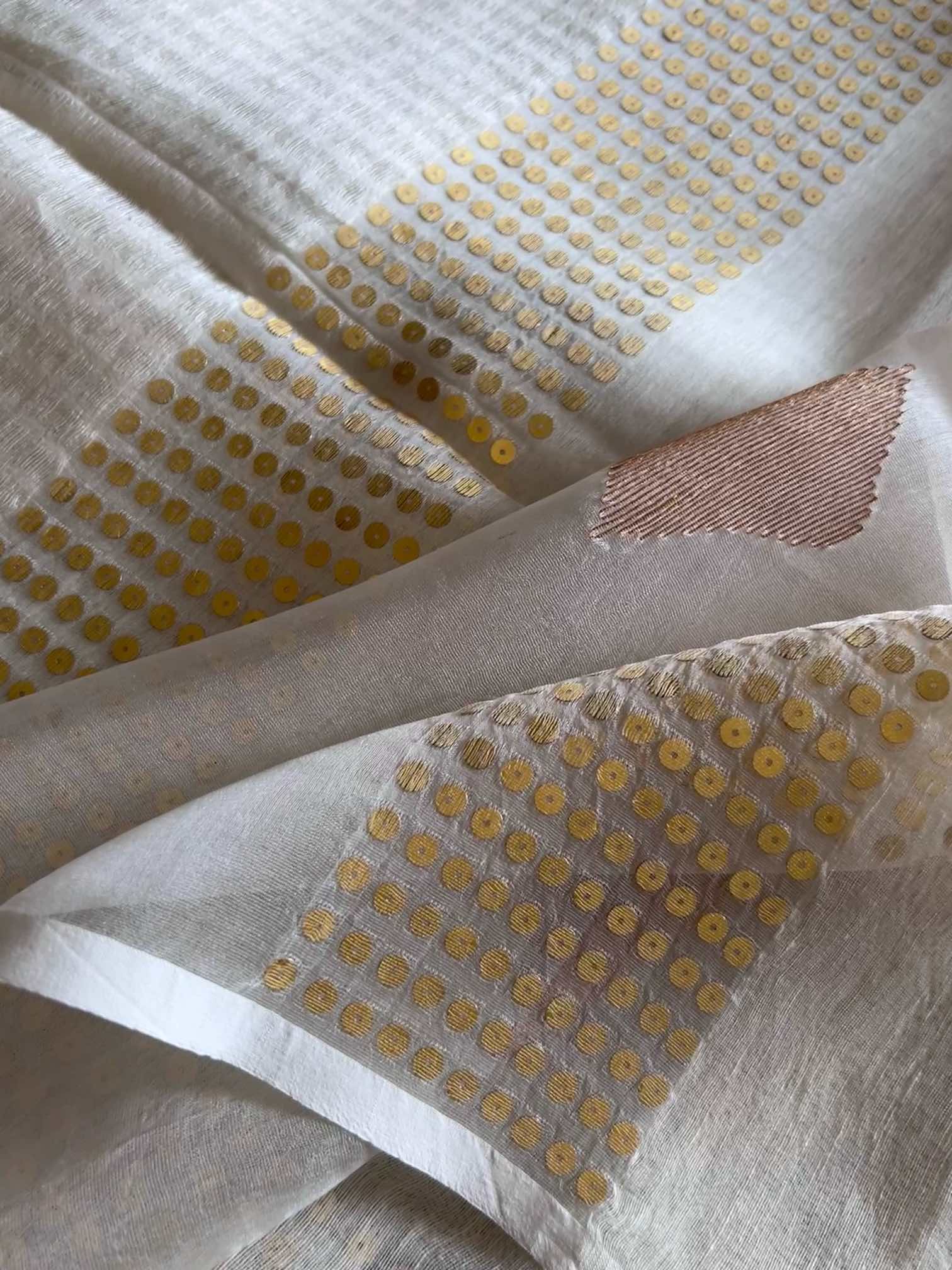 Pure muslin silk with gini work is a stunning blend of softness and sparkle. The airy elegance of muslin silk pairs beautifully with the intricate shimmer of gini embroidery, creating a fabric that’s both graceful and regal. The 6-heald handloom technique allows intricate placement of pocket sequins, subtly catching the light with every movement. The subtle shimmer and refined finish exude timeless sophistication, capturing light and movement with quiet luxury.