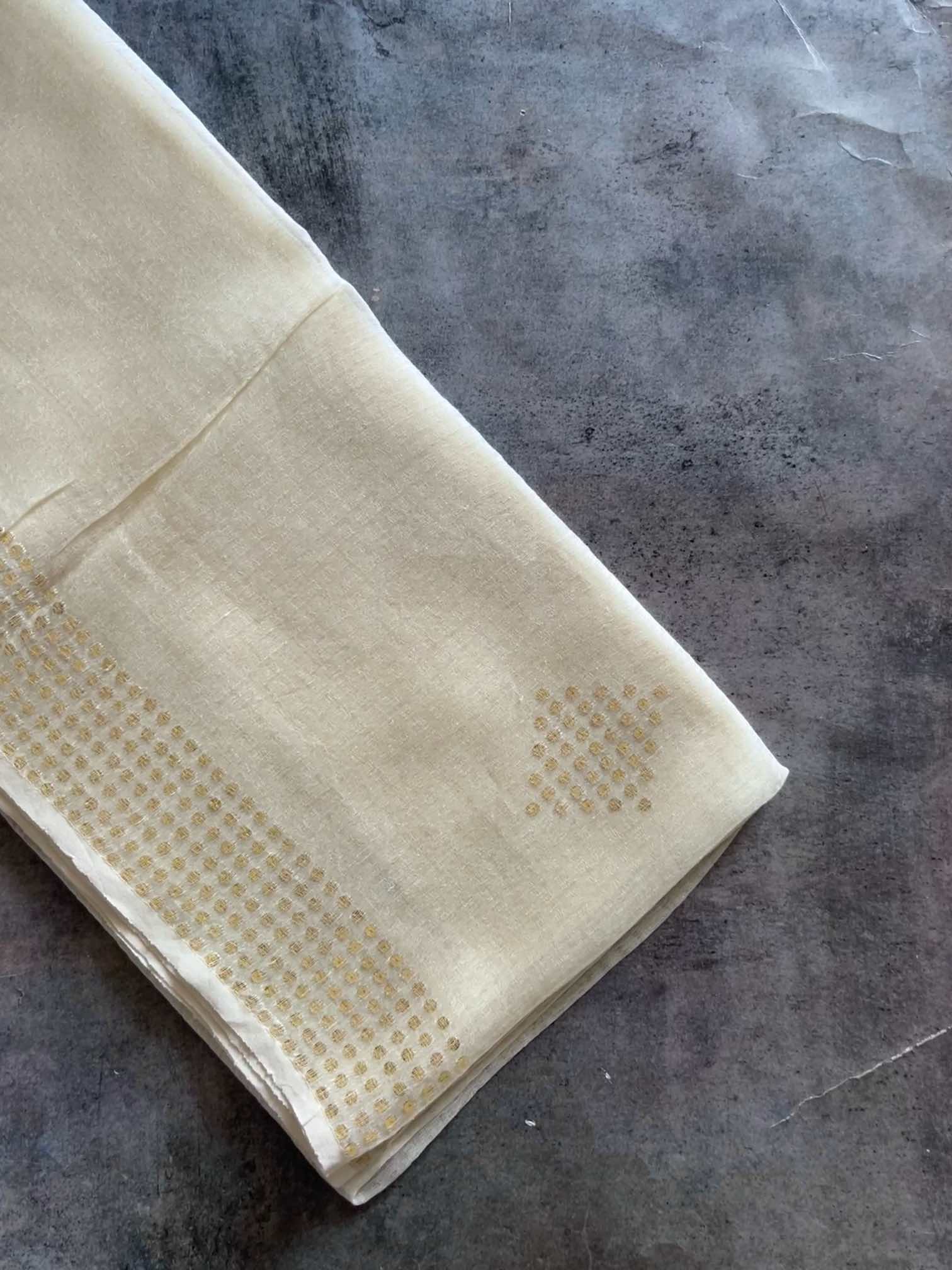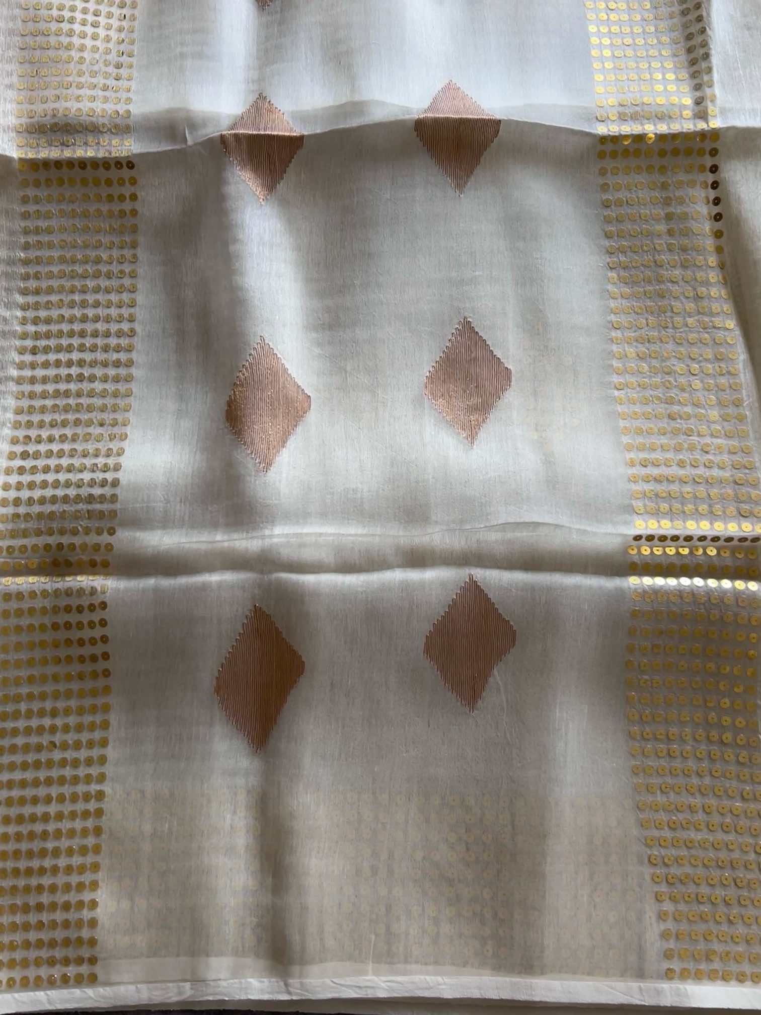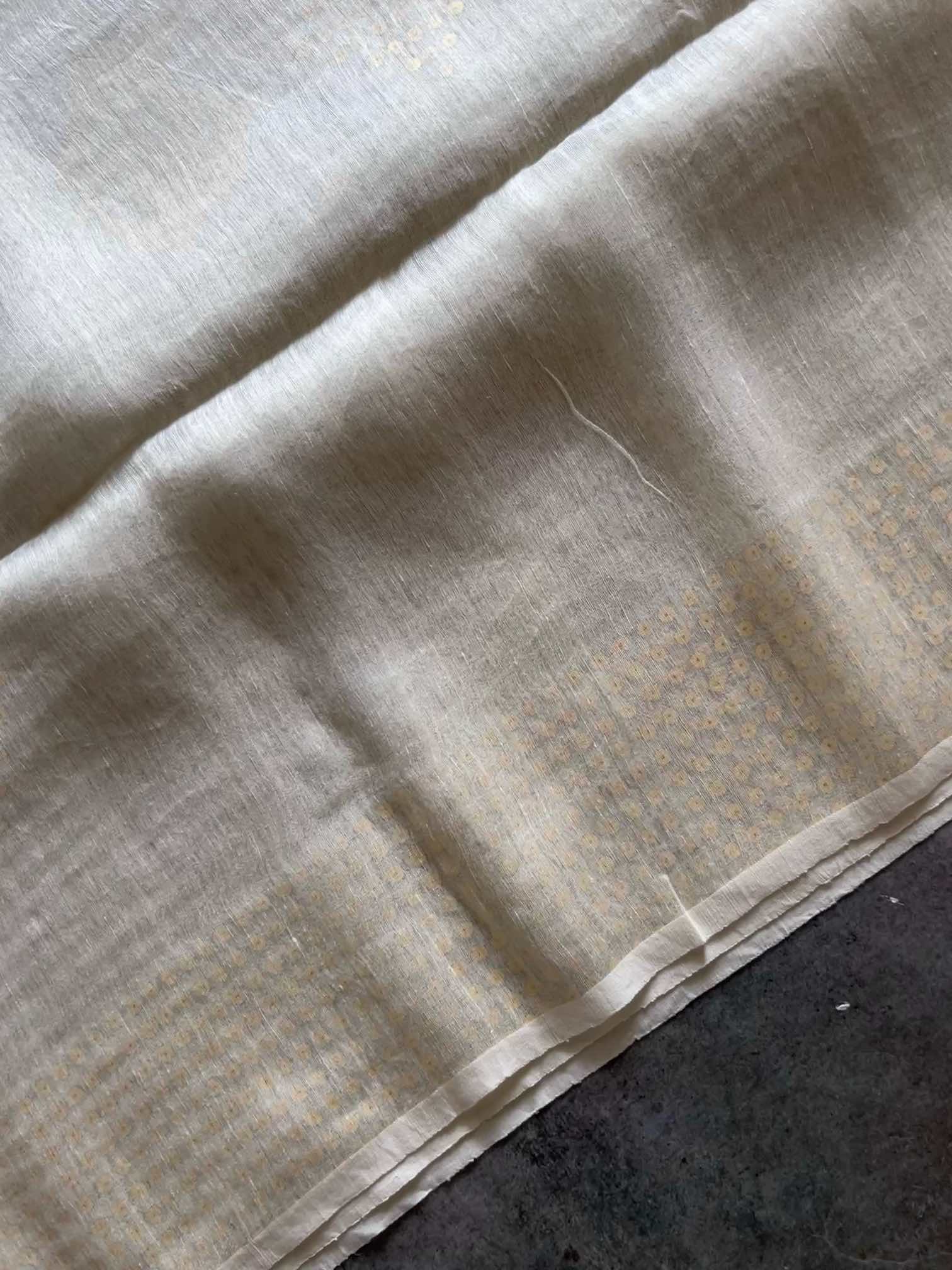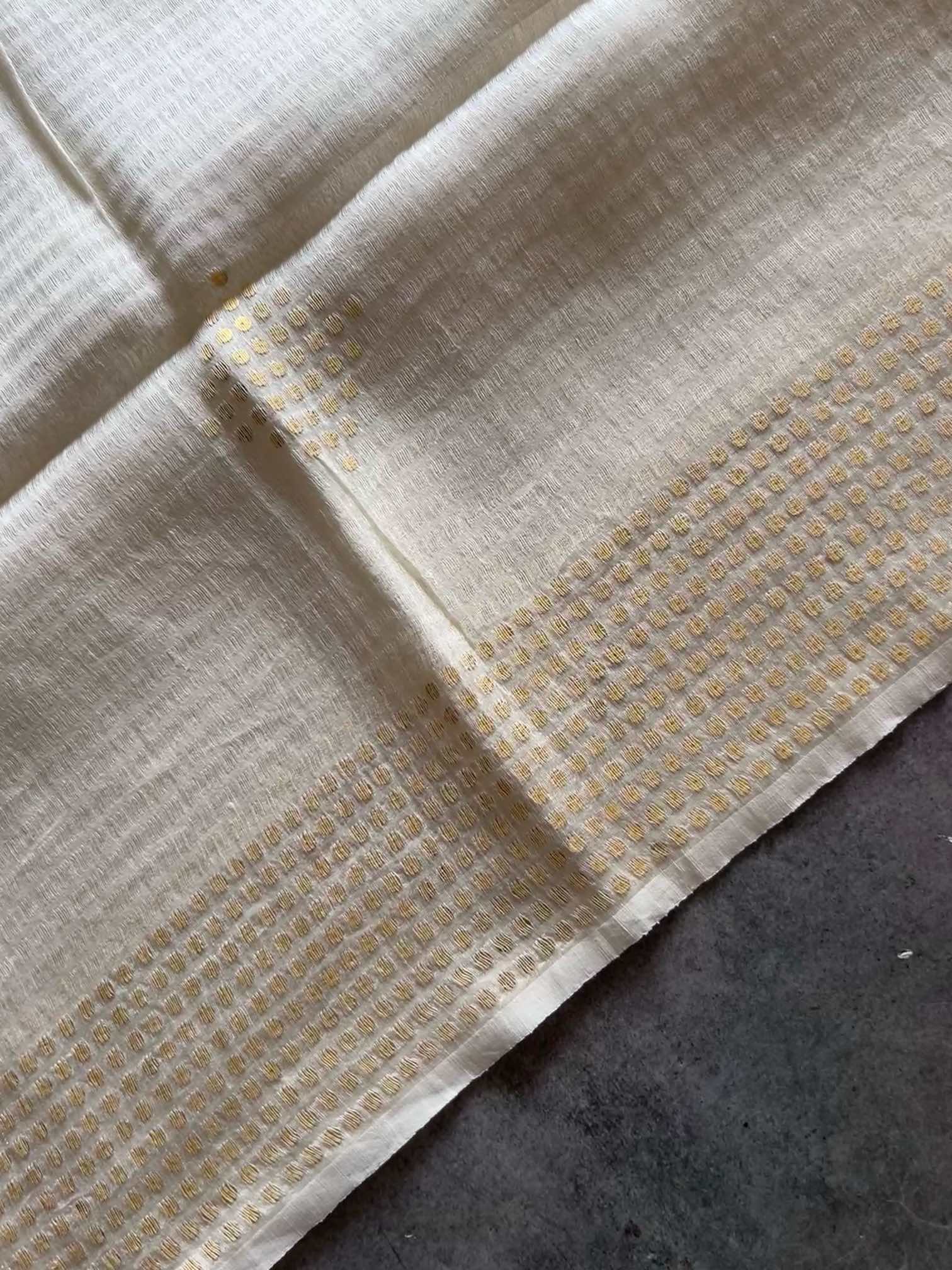 Pure muslin silk with gini work is a stunning blend of softness and sparkle. The airy elegance of muslin silk pairs beautifully with the intricate shimmer of gini embroidery, creating a fabric that’s both graceful and regal. The 6-heald handloom technique allows intricate placement of pocket sequins, subtly catching the light with every movement. The subtle shimmer and refined finish exude timeless sophistication, capturing light and movement with quiet luxury.