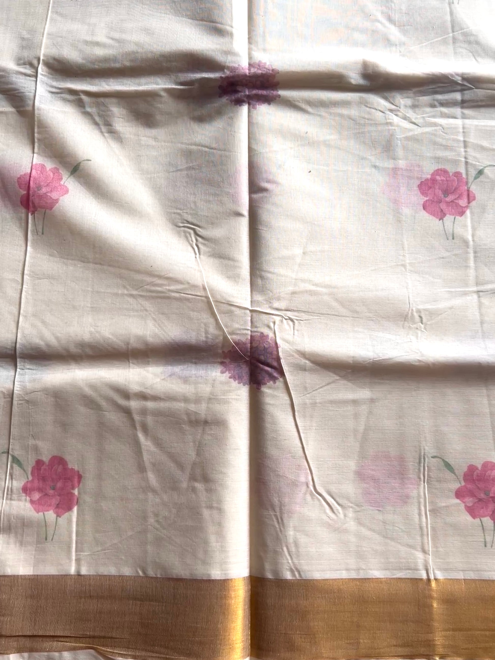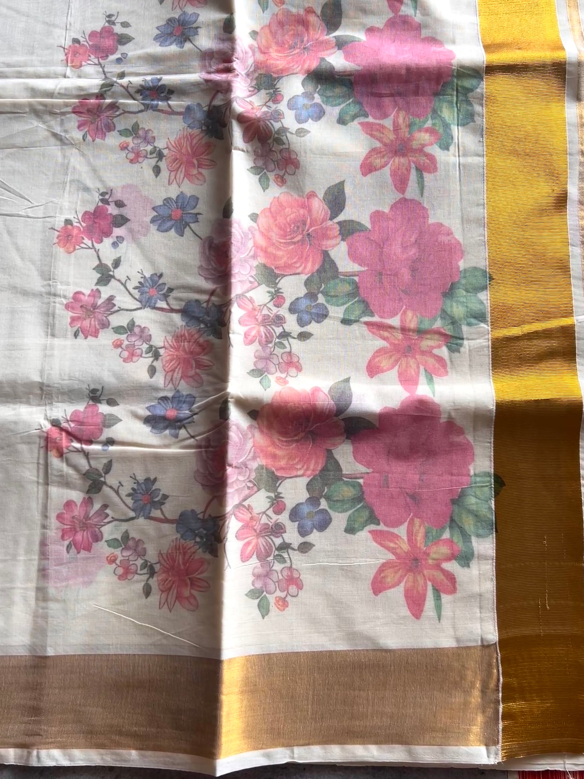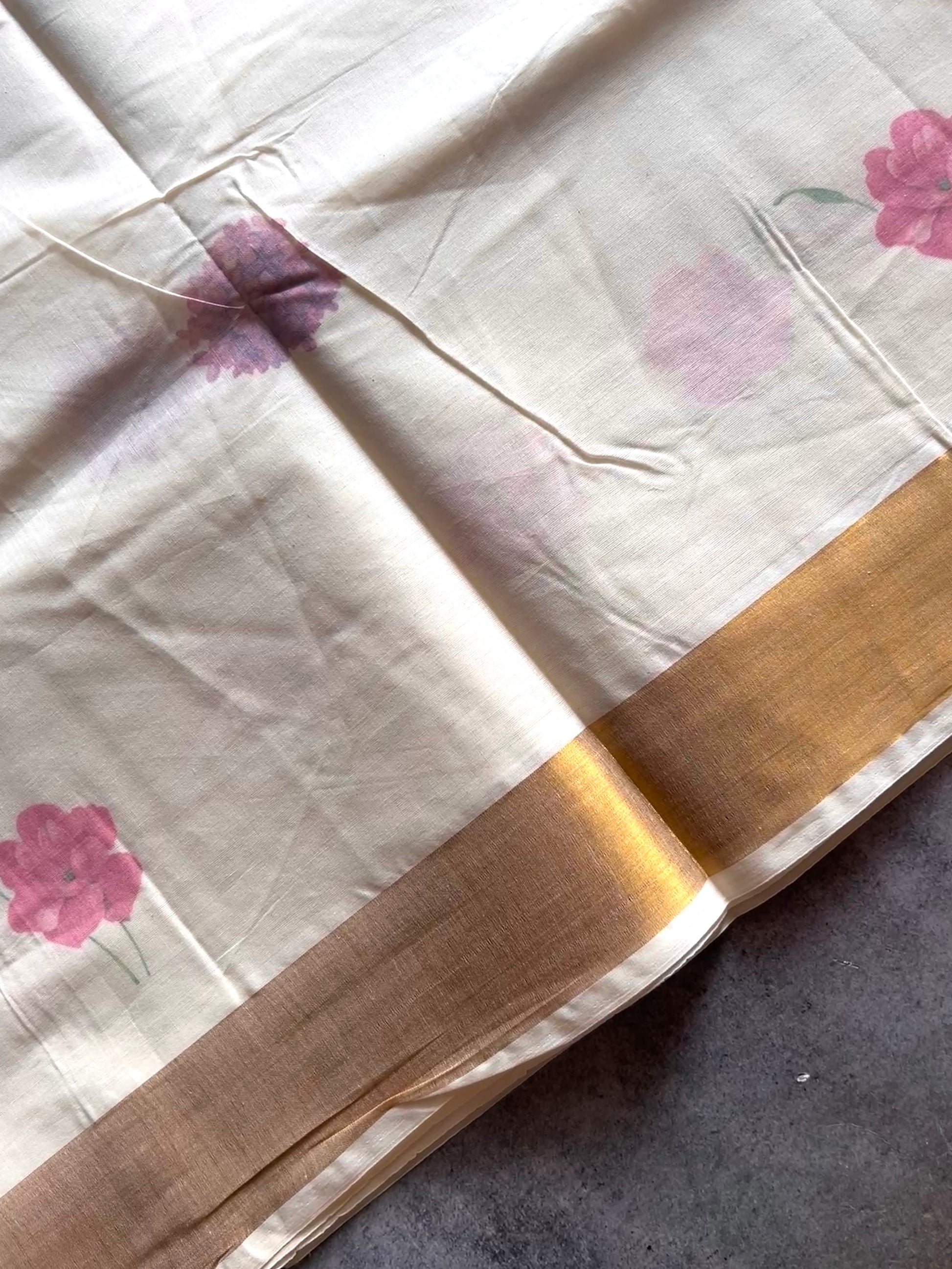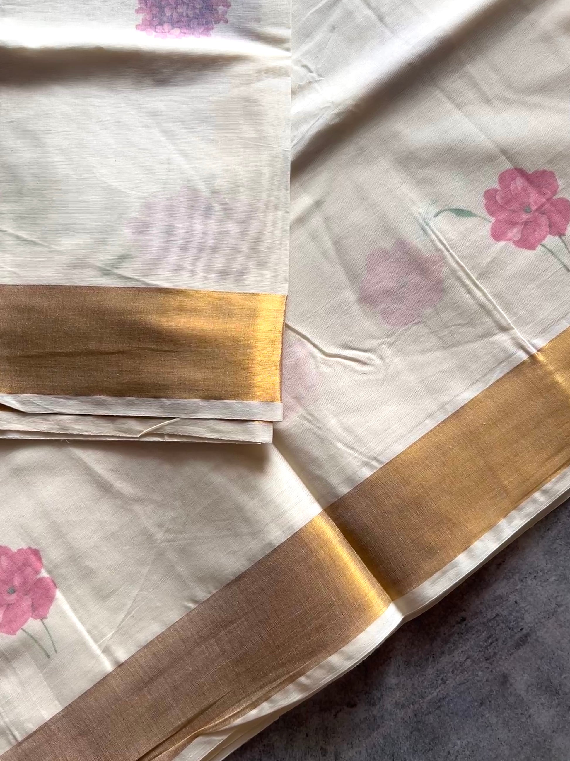 The soft cotton offers comfort and ease, while the floral prints add a delicate, festive charm that mirrors the blooming pookalam (flower rangoli). These sarees blend the grace of Kerala's heritage with a touch of modern artistry, making them a perfect choice for celebrating Onam with style and grace.