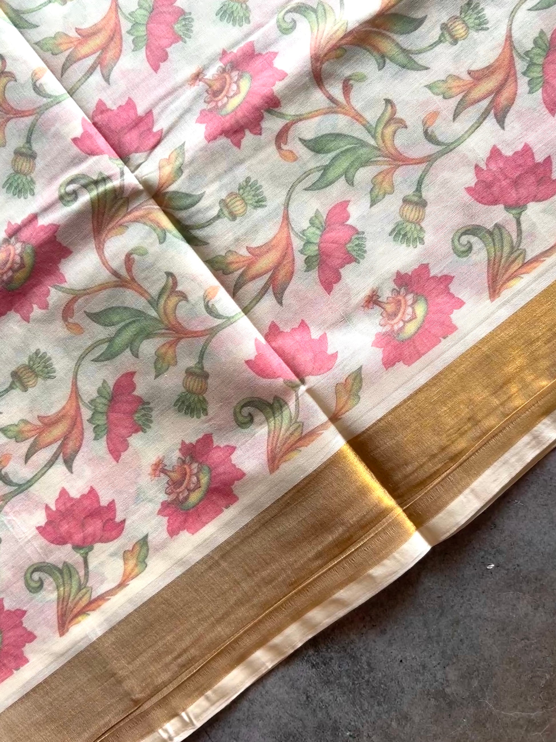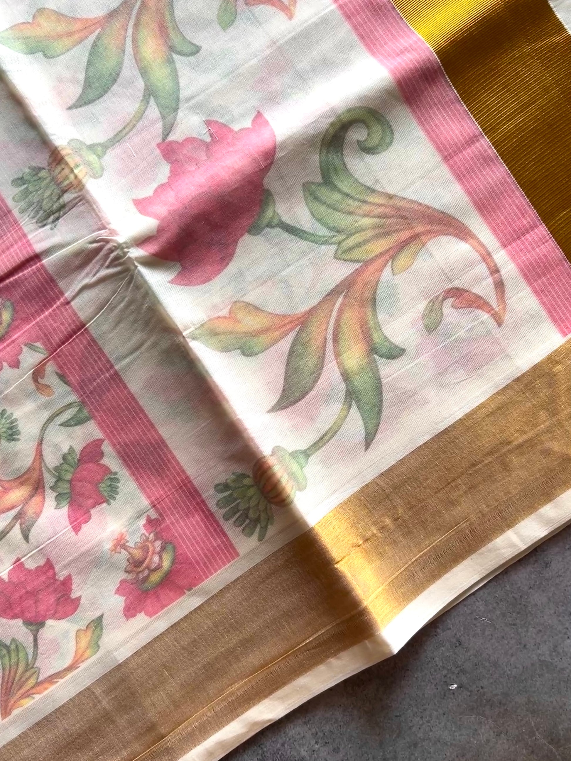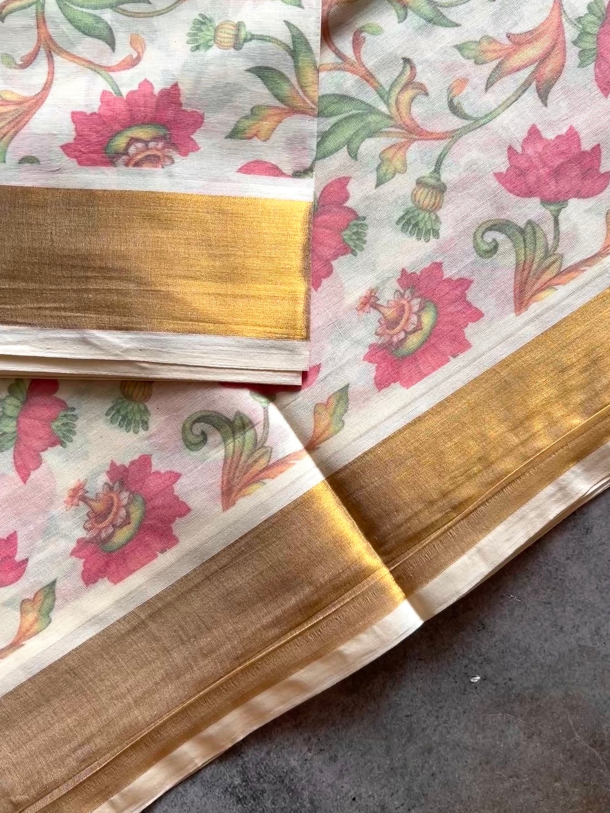 The soft cotton offers comfort and ease, while the floral prints add a delicate, festive charm that mirrors the blooming pookalam (flower rangoli). These sarees blend the grace of Kerala's heritage with a touch of modern artistry, making them a perfect choice for celebrating Onam with style and grace.
