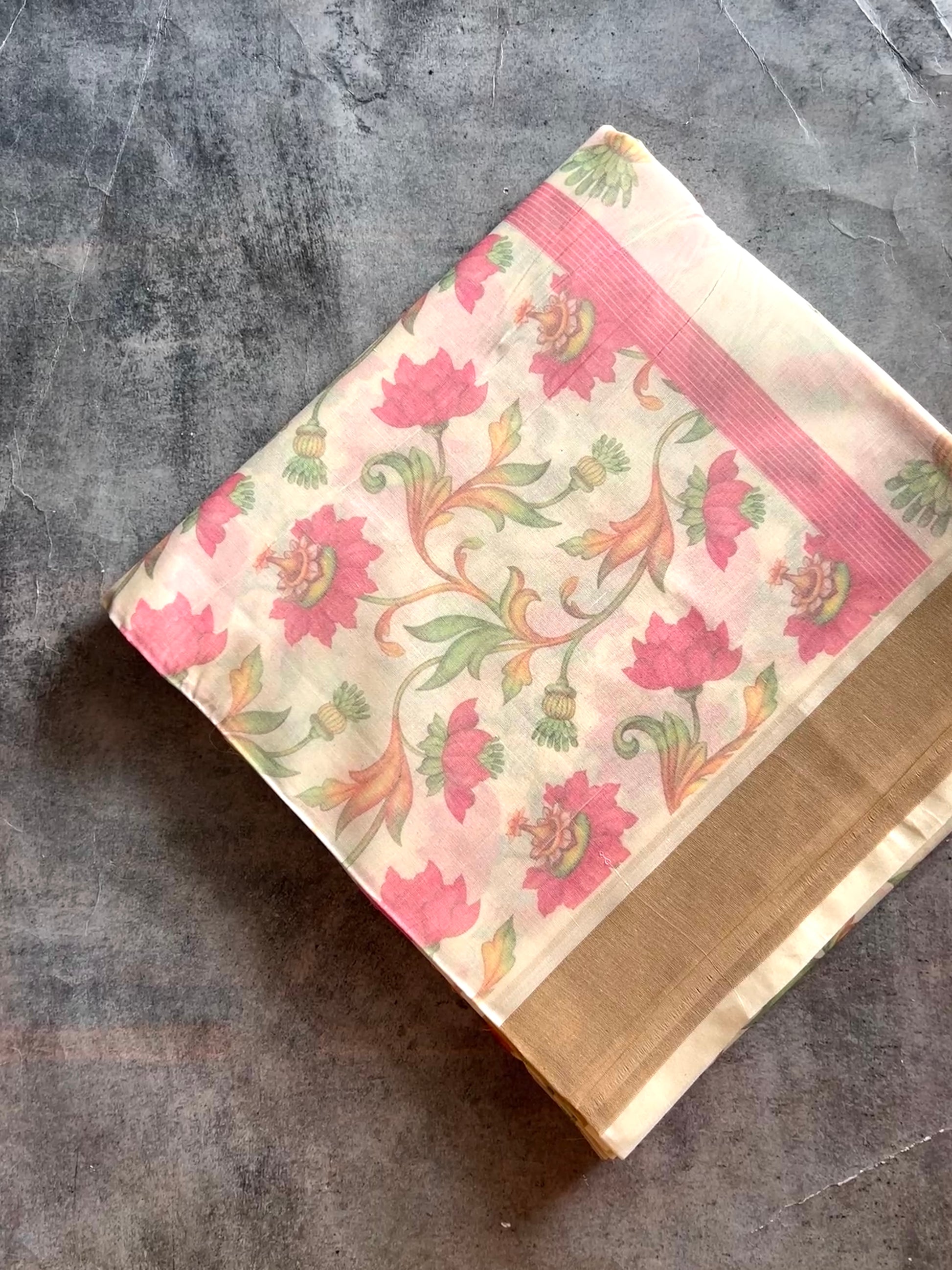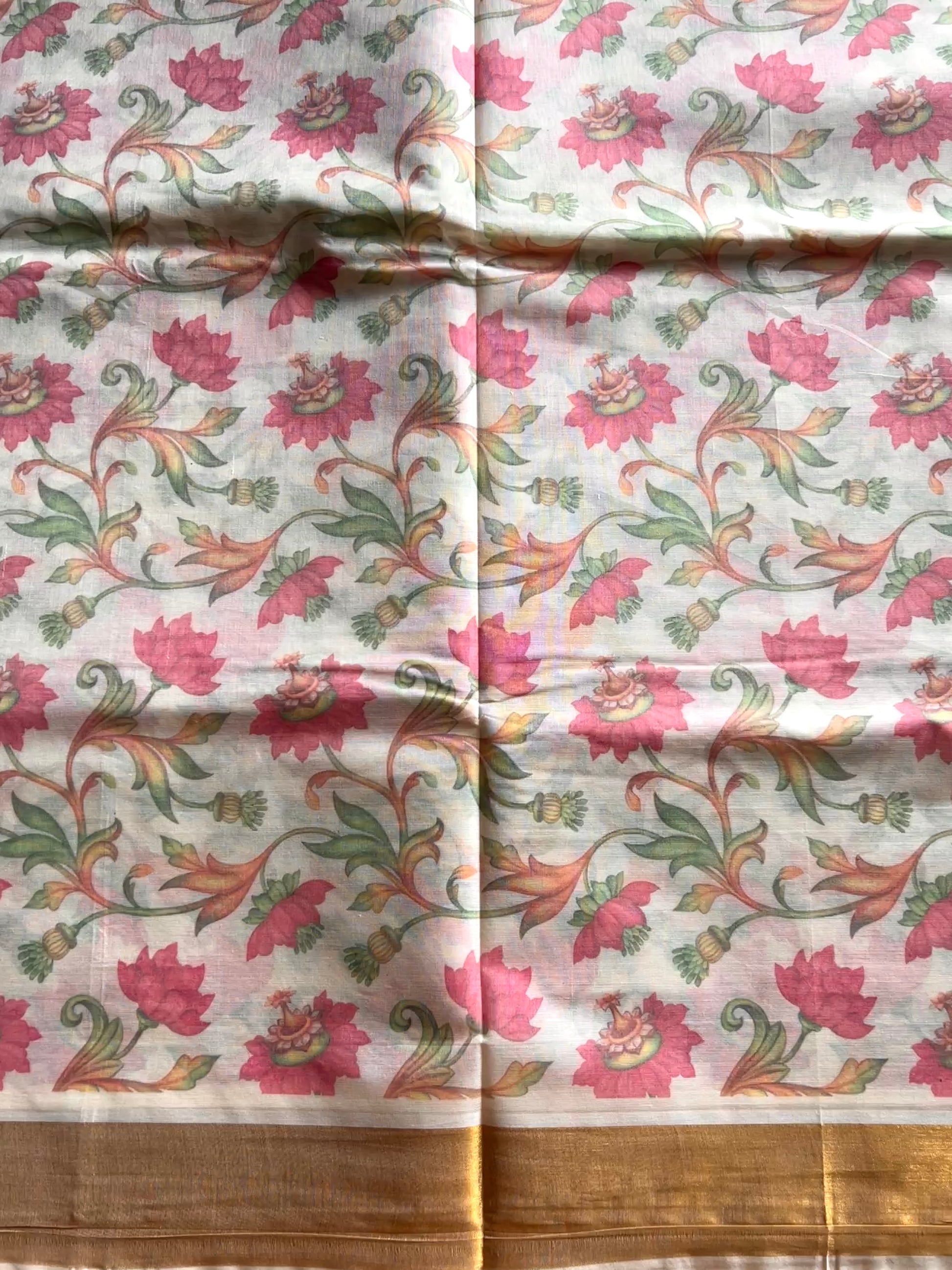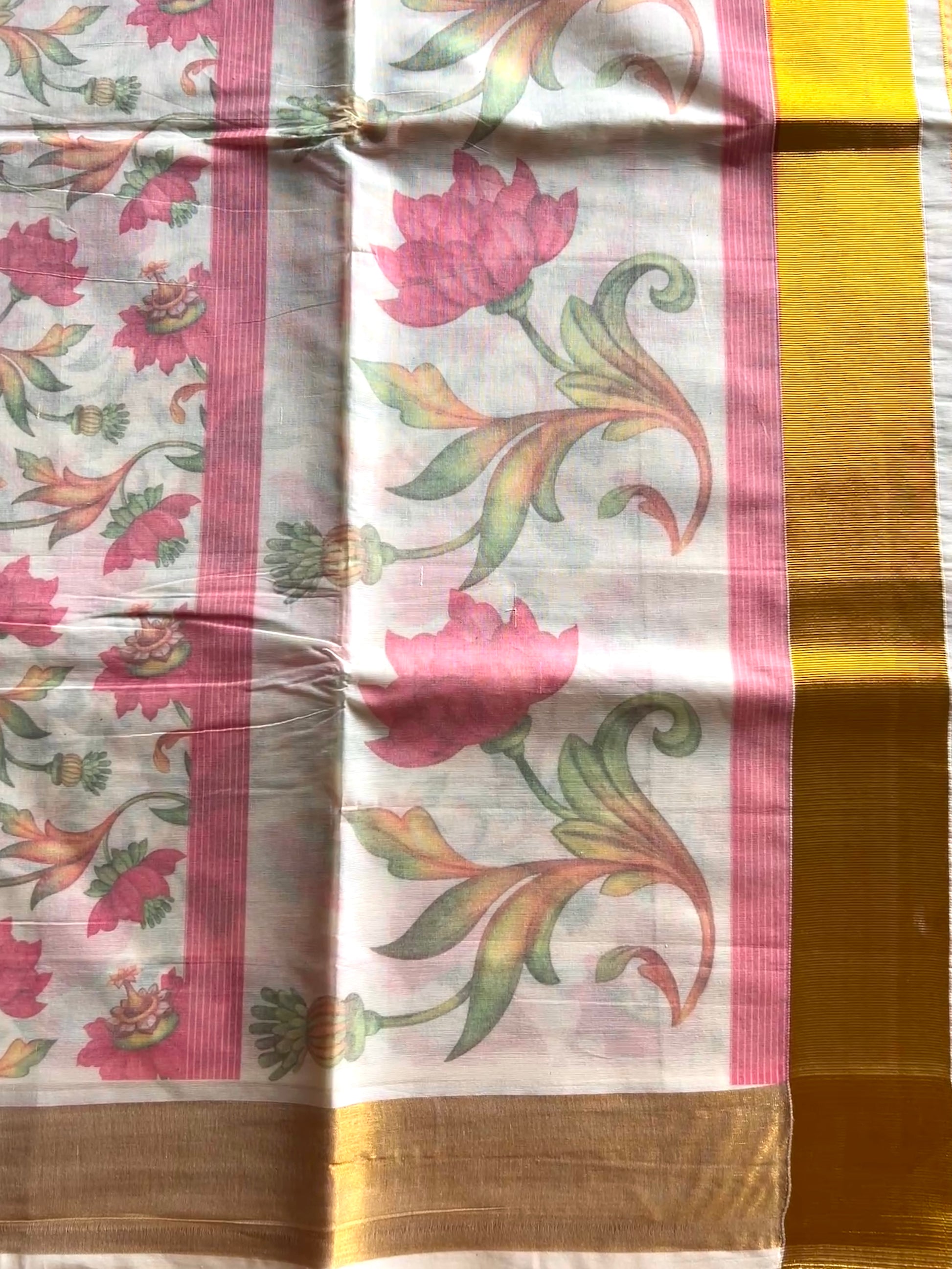 The soft cotton offers comfort and ease, while the floral prints add a delicate, festive charm that mirrors the blooming pookalam (flower rangoli). These sarees blend the grace of Kerala's heritage with a touch of modern artistry, making them a perfect choice for celebrating Onam with style and grace.