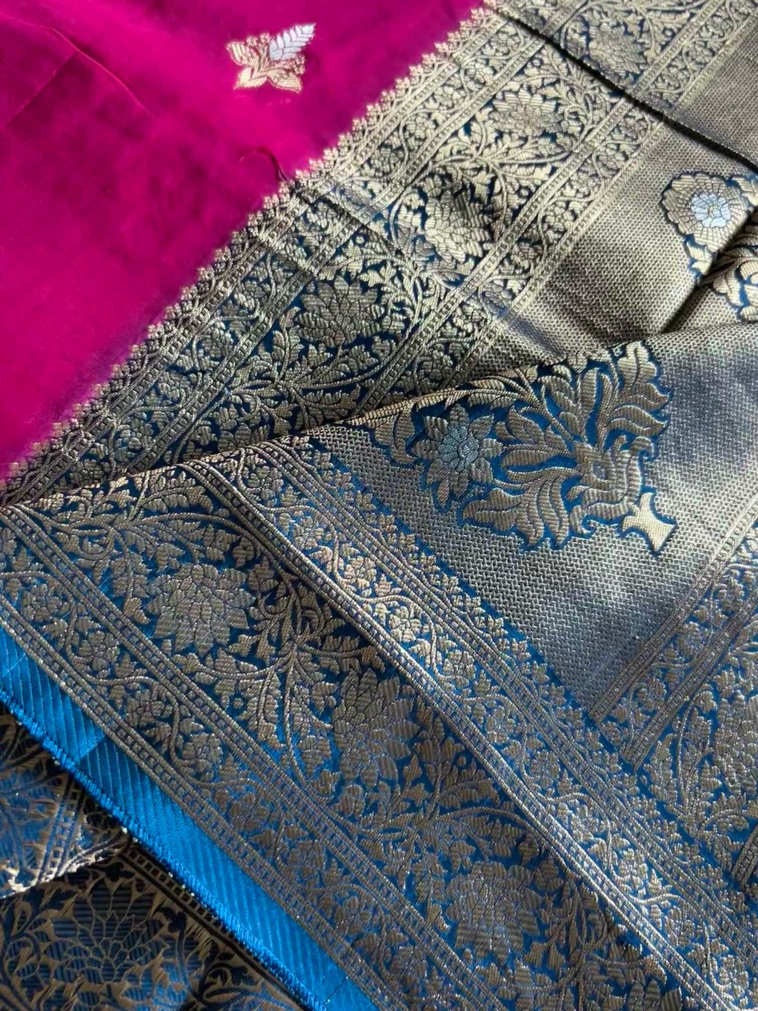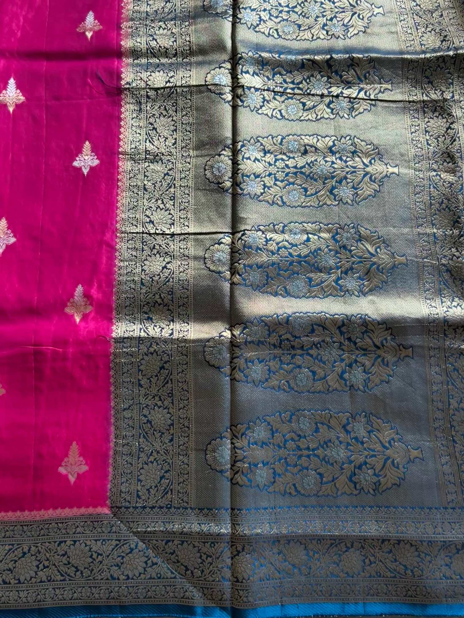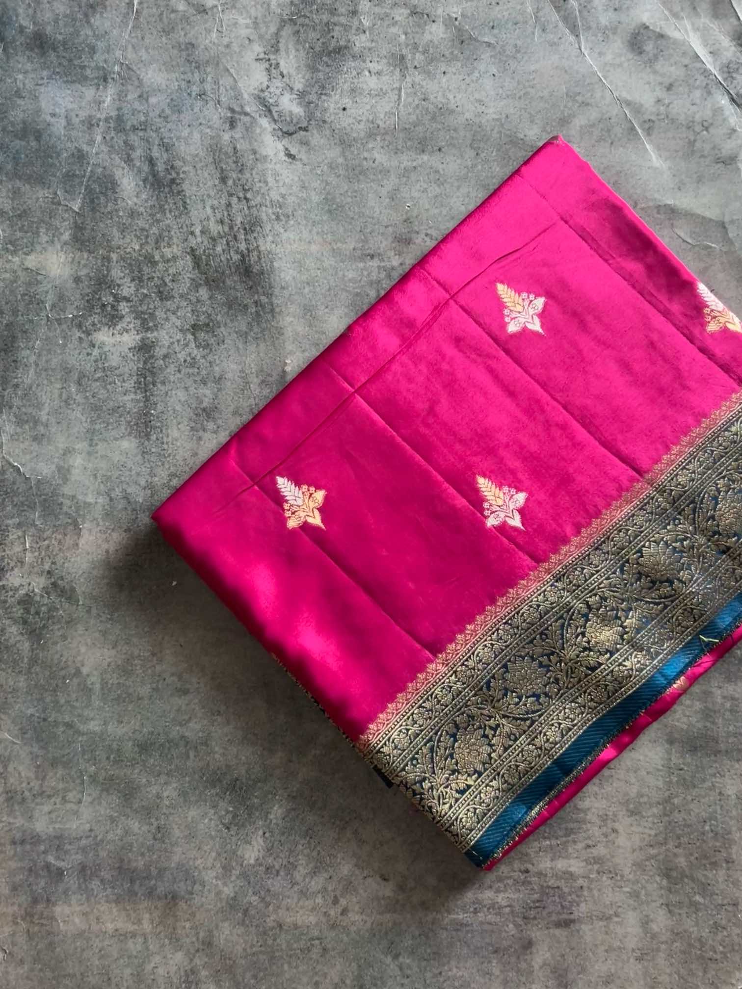 A dola silk saree with a brocade border and zari butta is the epitome of timeless elegance. Its soft, lustrous texture drapes gracefully, while the rich brocade border adds regal depth. The delicate zari buttas shimmer subtly across the fabric, creating a perfect harmony of tradition and sophistication—ideal for celebrations that call for understated luxury.